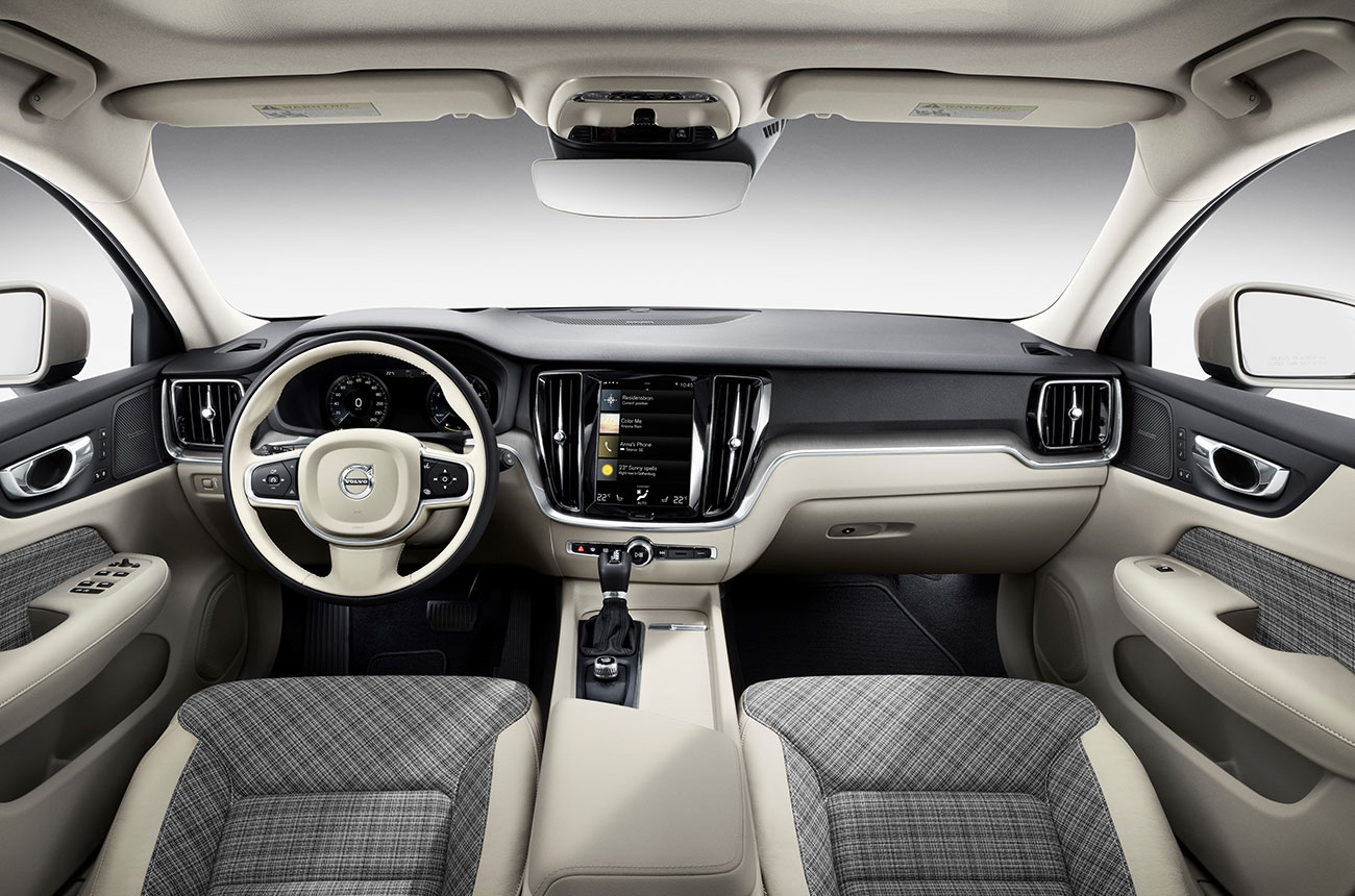 Dentro del habitáculo la Volvo V60 se muestra con colores claros que le brindan mayor luminosidad al habitáculo. También se destaca la gran pantalla multifunción con el sistema que refleja el contenido de los smartphones y las salidas de aire a su lado de un tamaño considerable. Materiales de gran calidad y diferentes inserciones le otorgan un ambiente exclusivo.